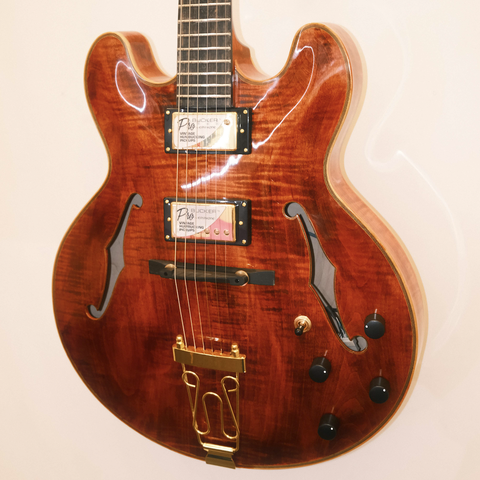 جيتار كهربائي يدوي الصنع من يونزي لوتييه، 16 بوصة، جاز بهيكل مجوف، خشب القيقب المموج، سطح من خشب التنوب الأخضر/الأبنوس، 6 أوتار